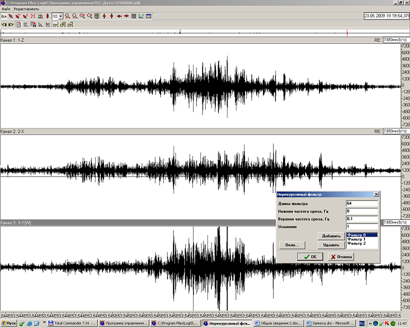 Ниже приведены примеры сейсмологической обработки записей по Сахалину. Сами записи похожи на роевой шум. Если их перевести по линейке частот в слышимый звуковой диапазон, а MATLAB такую возможность предоставляет, появляется уникальный шанс прослушивать сейсмическую жизнь Земли в человеческом диапазоне частот. Аналогичный роевой шум фиксировался нами в 2008 году на Красной Поляне.