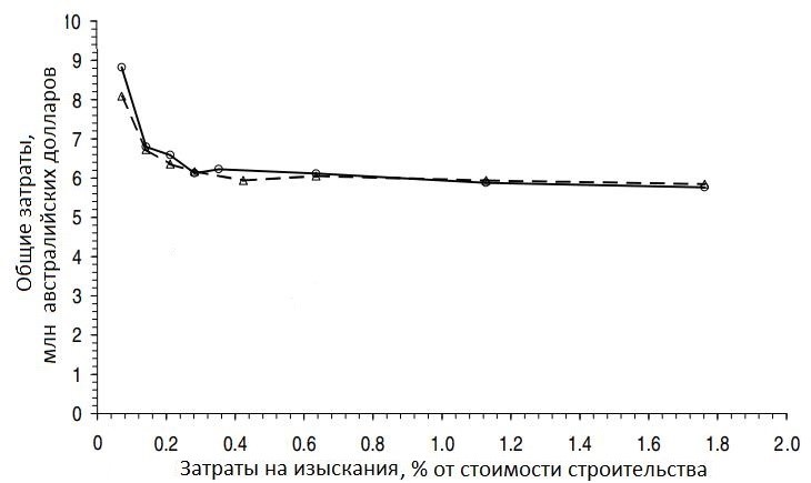 В большинстве случаев оптимальные затраты на изыскания для моделируемой ситуации составили 0,2 0,3% от общей стоимости проекта. При этом увеличение расходов на них с 0,1 до 0,3% снижало общую стоимость проекта примерно с 8 до 6 млн австралийских долларов. Это было бы значительной экономией при увеличении расходов на изыскания всего на 20 000 долларов.