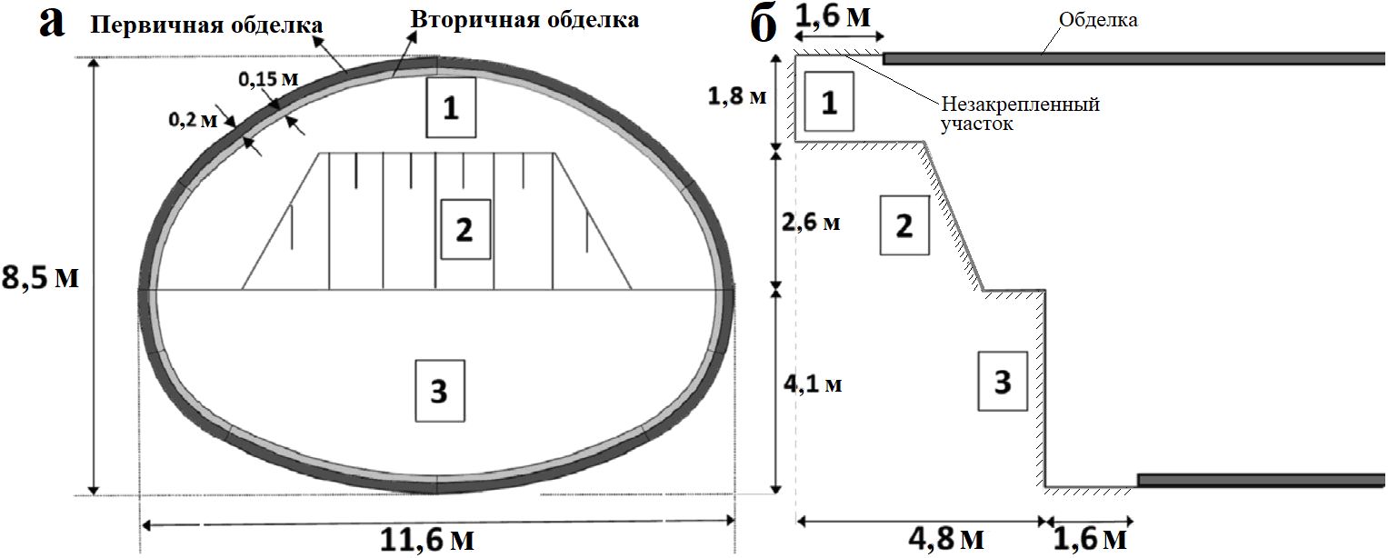 На рисунке 1 показаны поперечное сечение тоннеля и последовательность выемки грунта. Поперечное сечение имело эллипсоидальную форму (ширину 11,6 м и высоту 8,5 м). Выемка выполнялась в последовательности «1 – 2 – 3» от свода по двум уступам к обратному своду (см. рис. 1). Выемка проводилась шагами по 1,6 м. Для повышения устойчивости забоя сохранялось два уступа. Сразу после выемки в зоне свода устанавливалось два комплекта стальных ребер, расположенных с шагом 0,8 м, и на внутреннюю поверхность тоннеля наносили слой набрызг-бетона толщиной 0,2 м. Выемку в зоне обратного свода проводили в 4,8 м от верхней части забоя, также продвигаясь шагами по 1,6 м. На обратный свод тоннеля также наносили слой набрызг-бетона толщиной 0,2 м, но армированного проволочной сеткой. Позже создавали вторичную обделку тоннеля из монолитного бетона (железобетона) толщиной 0,15 м.