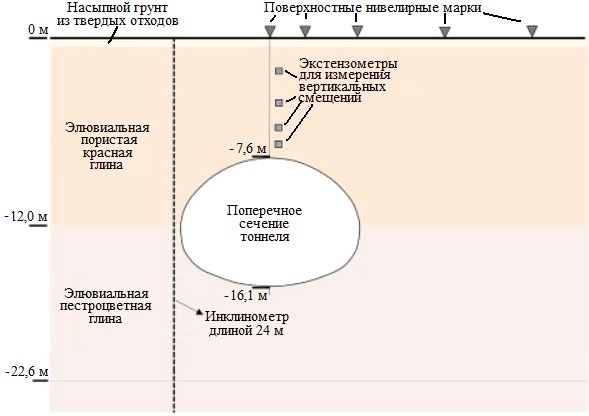Рис. 2. Инженерно-геологические условия и контрольно-измерительная аппаратура для мониторинга поведения тоннеля и вмещающего его грунтового массива [1]