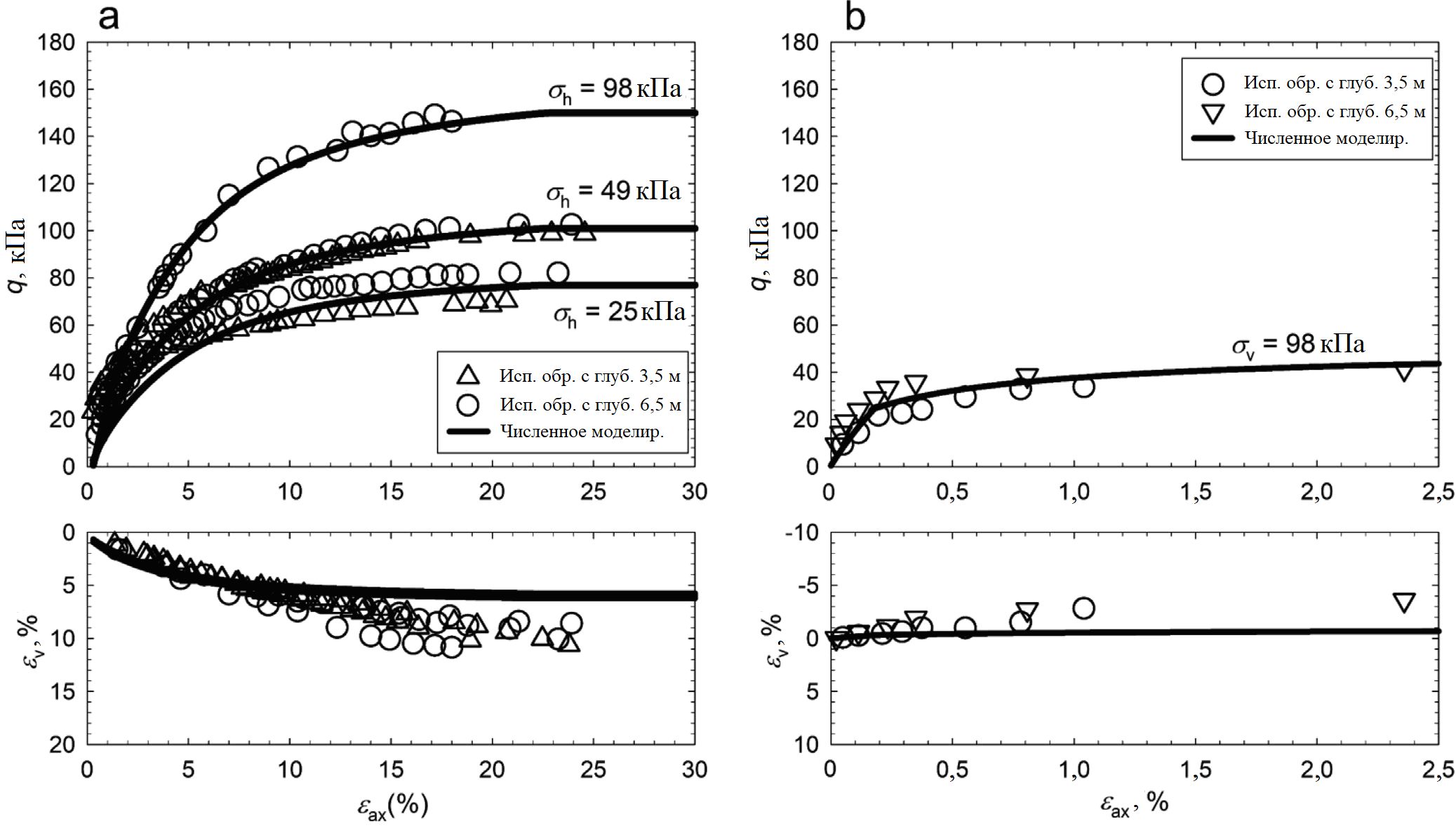 На рисунке 3 представлены зависимости максимальных напряжений сдвига q = (σ1 – σ3)/2 и относительных объемных деформаций в зависимости от относительной осевой деформации, полученные по данным трехосных испытаний при нагружении (см. рис. 3, а) и разгрузке (см. рис. 3, б). Также показаны результаты численного моделирования трехосных испытаний – откалиброванные кривые на основе модели упрочняющегося грунта (Schanz et al., 1999). Последние, как видно из рисунка 3, неплохо соответствуют экспериментальным данным.