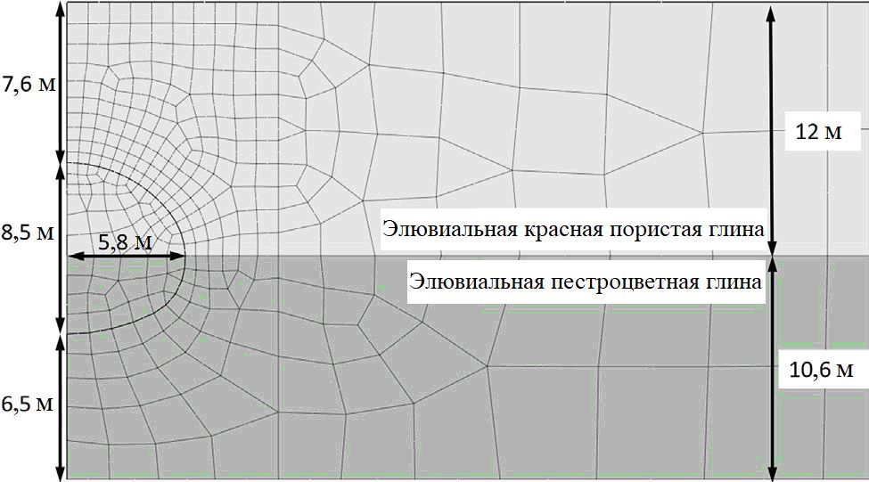 Длина шагов выемки грунта составляла 1,6 м. А длина гексаэдрических элементов второго порядка была равна 0,8 м. Поэтому продольная густота сетки конечных элементов была достаточной для получения точных результатов (Vitali et al., 2018).