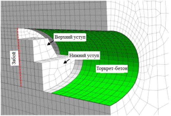 Рис. 6. Численное моделирование последовательности выемки грунта в забое тоннеля Параисо [1]