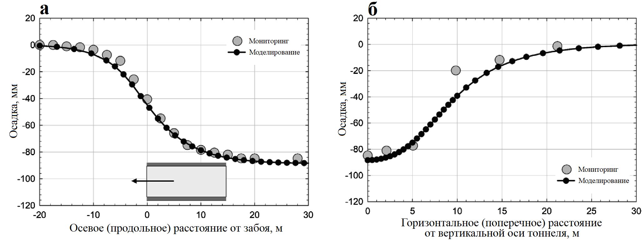 На рисунке 7 показаны осадки дневной поверхности в зависимости от продольного расстояния от забоя тоннеля (см. рис. 7, а) и от поперечного горизонтального расстояния от вертикальной оси тоннеля (см. рис. 7, б), то есть продольный профиль и мульда осадок соответственно, полученные при мониторинге и при численном моделировании. Численные результаты и измеренные деформации грунта показали убедительное соответствие друг другу.