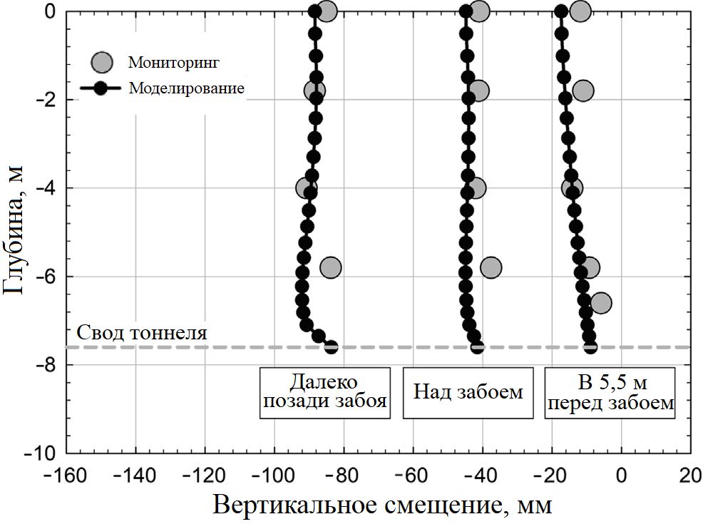 На рисунке 8 показаны вертикальные смещения грунта над сводом тоннеля на разной глубине и на разных расстояниях от забоя (расположение вертикального экстензометра показано на рисунке 2). Результаты численного моделирования и данные мониторинга и здесь убедительно совпали. Вертикальные смещения оказались практически одинаковыми на разной глубине. Далеко позади забоя численная модель показала резкое уменьшение вертикальных смещений вблизи свода, что связано с трехмерными эффектами забоя. Подобное поведение отличалось от ожидаемого (Mair et al., 1993), при котором вертикальные смещения над сводом тоннеля увеличивались с глубиной. Возможно, это является результатом больших объемных деформаций, возникающих из-за повышенной сжимаемости элювиальных пористых грунтов (Ortigao, Macedo, 1993; Ortigгo et al., 1996; Marques, 2006; Nakai et al., 1997).