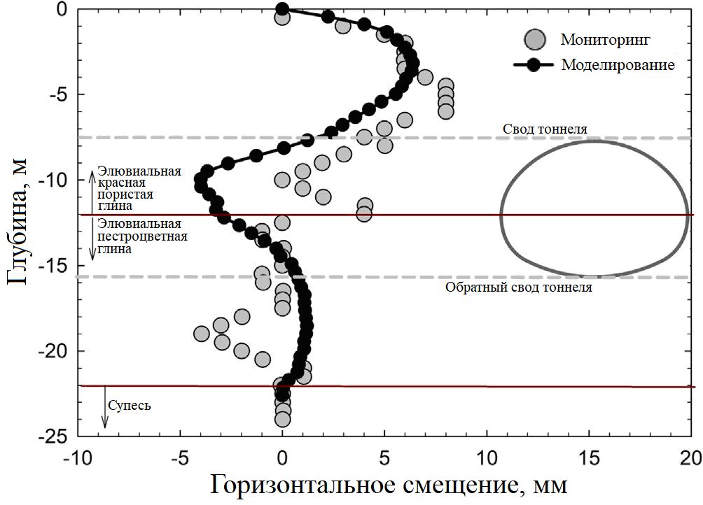 На рисунке 9 изображены горизонтальные смещения вблизи боков (пят свода) тоннеля (расположение инклинометра представлено на рисунке 2). На дневной поверхности они оказались нулевыми, так как их сдерживала мостовая. Горизонтальные смещения увеличивались до достижения глубины около 6 м от поверхности (1,6 м над сводом тоннеля), а затем снижались до нуля на глубине 10 м. Затем они снова увеличивались, достигнув пика при переходе от элювиальной красной пористой глины к элювиальной пестроцветной глине. Ниже этой границы, на глубине 12 м, наблюдались очень незначительные смещения пестроцветной глины вплоть до глубины 18 м. На глубине от 18 до 20 м (на 2–4 м ниже обратного свода тоннеля) инклинометр зарегистрировал неожиданное увеличение горизонтальных смещений. На еще большей глубине деформации грунта, представляющего собой полутвердую глину, должны быть малы.