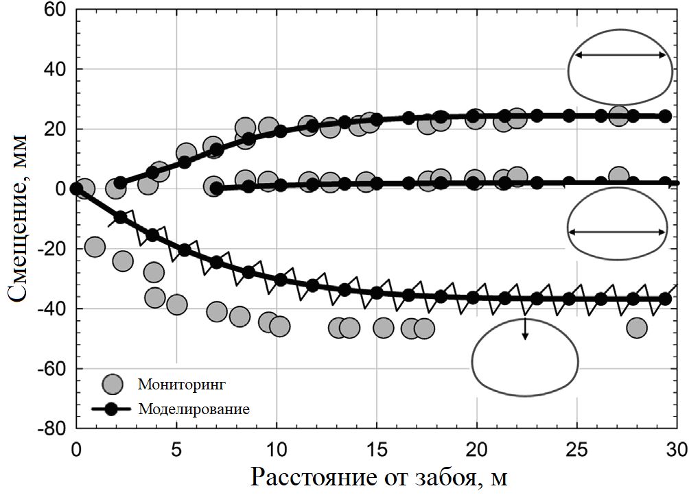 На рисунке 10 показаны вертикальные смещения первичной обделки свода (торкрет-бетона со стальной арматурой) и относительные горизонтальные смещения боков тоннеля в зависимости от осевого (продольного) расстояния от забоя тоннеля. Смещения увеличивались с расстоянием от забоя до приблизительно 10 м позади него (примерно на один диаметр тоннеля), где деформации обделки стали постоянными. Большие деформации (вплоть до 46 мм) наблюдались в своде тоннеля, в то время как в обратном своде они были пренебрежимо малыми. Смещения в двух местах по периметру тоннеля, рассчитанные с помощью численной модели, хорошо совпали с измеренными.