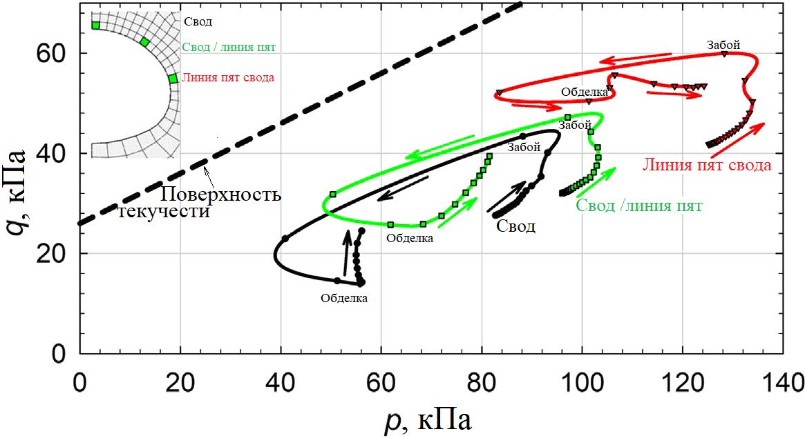 На рисунке 11 показаны траектории напряжений для точек в грунте по периметру на расстоянии 0,25 м от его контура (что позволило избежать сингулярности в остром углу забоя в месте, где забой пересекал периметр).