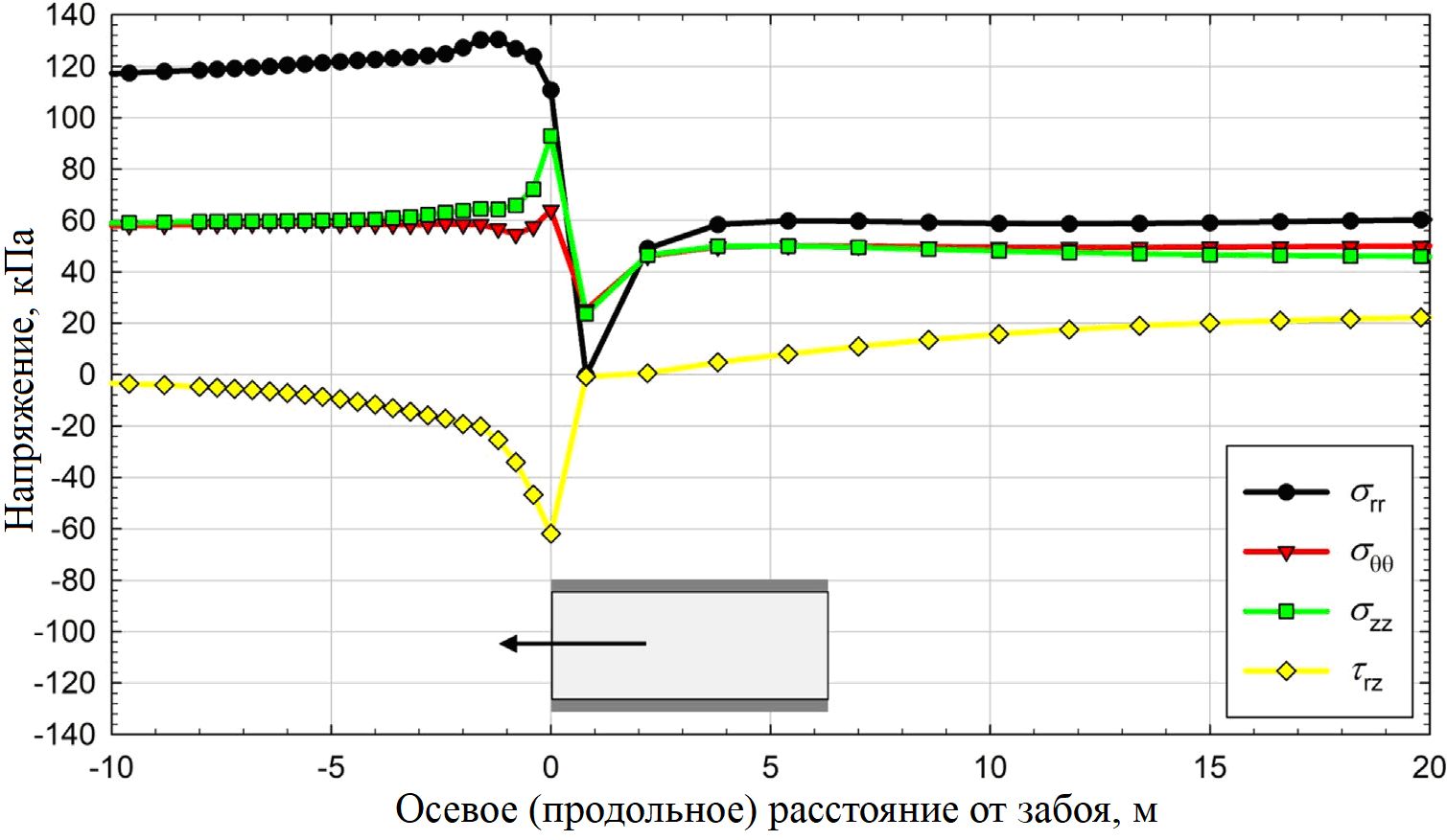 Рис. 12. Напряжения в грунте у свода тоннеля в зависимости от осевого (продольного) расстояния от забоя. Буквенные обозначения: σrr – радиальное напряжение; σθθ – тангенциальное напряжение; σzz – осевое напряжение; τrz – осевое напряжение сдвига