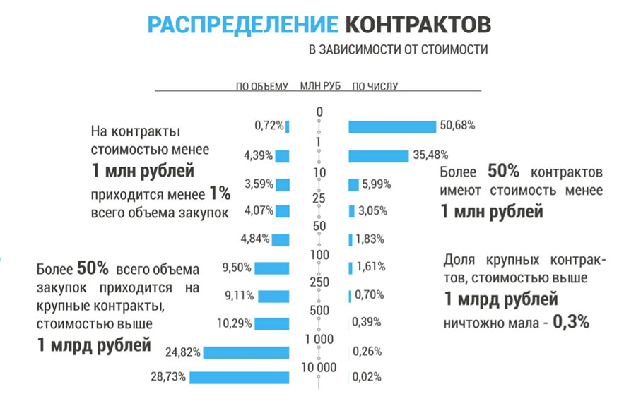 На рисунке 7 представлен график распределения контрактов в зависимости от их стоимости. Из него видно, что 50% всех контрактов имеют стоимость до 1 млн рублей и формируют менее 1% от общего объема закупок. С другой стороны, всего 600 контрактов сформировали более 53% всего объема рынка государственного заказа в строительстве.