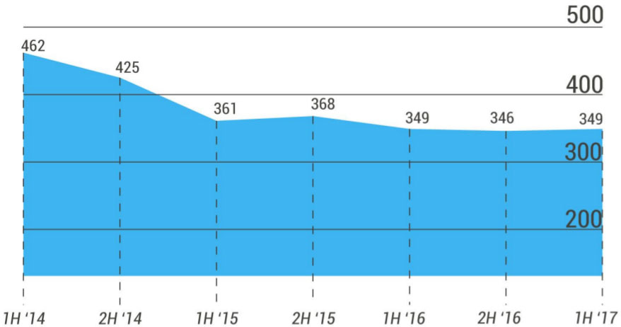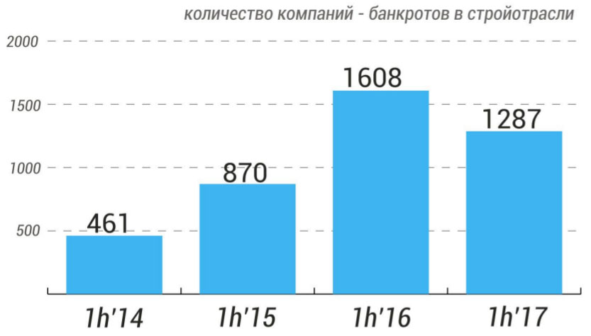 По нашим данным, в отрасли сейчас присутствует кризис неплатежей, причем как по кредитным обязательствам, так и по взаиморасчетам между контрагентами. Особенно это заметно при рассмотрении динамики числа поданных заявлений о начале процедуры банкротств. Данный показатель сильно коррелирует с уровнем неплатежей в отрасли.  Если принять за основу весь строительный рынок, включая все подрядные организации, то мы на текущий момент видим неутешительную статистику. На рисунке 5 представлены данные по банкротствам за первые полугодия: в 2015 году – порядка 870 компаний, в 2016 год – уже 1608, за первое полугодие 2017 года – 1287.  И это только те случаи, которые непосредственно дошли до судебных выяснений.