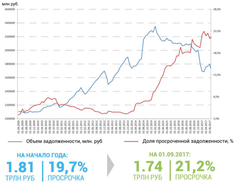 Ситуация с кредитованием строительной отрасли более тревожная. Мы видим краткосрочное улучшение ситуации по просроченной задолженности во втором квартале, но в летние месяцы уровень просрочки опять увеличился и по состоянию на 01.09 составил 21,2% против 19,7% на начало года (рис. 4.).