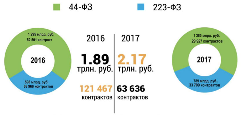 Рис. 3. Объем государственного заказа по 44-ФЗ и 223-ФЗ в 2016 и 2017 годах