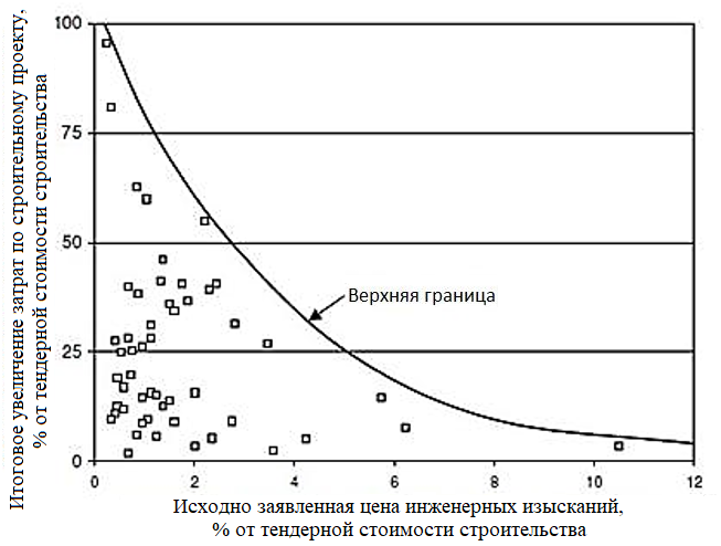 Рис. Влияние исходно заявленной стоимости инженерных изысканий на перерасходы по всему строительному проекту