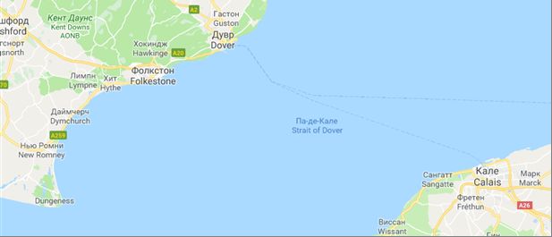 Рис. 3. Самая узкая часть Ла-Манша (пролив Па-де-Кале, или Дуврский) на карте. Синим пунктиром показаны паромные маршруты через пролив [26]