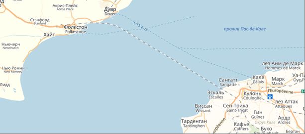 Рис. 9. Трасса железнодорожного тоннеля под дном пролива Па-де-Кале на карте [27]