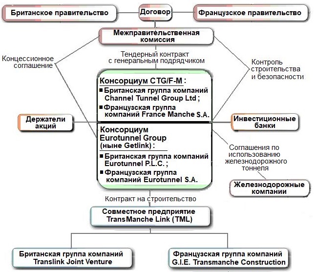 Рис. 10. Организационная структура, использованная при развитии проекта строительства тоннеля под Ла-Маншем (по [20])
