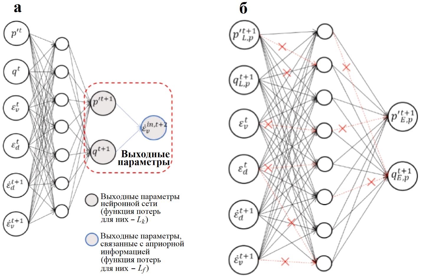 Рис. 7. Схема моделирования, принятая в работе Чжана и др. [163]: а – архитектура, показывающая входные параметры модели, а также взаимодействие между выходными параметрами нейронной сети и ограничениями, обусловленными законами физики (обведено красным) при использовании в данном примере инкрементального нелинейного моделирования; б – пример отключения части связей нейронной сети при дропауте по методу Монте-Карло (отключенные связи показаны красным)