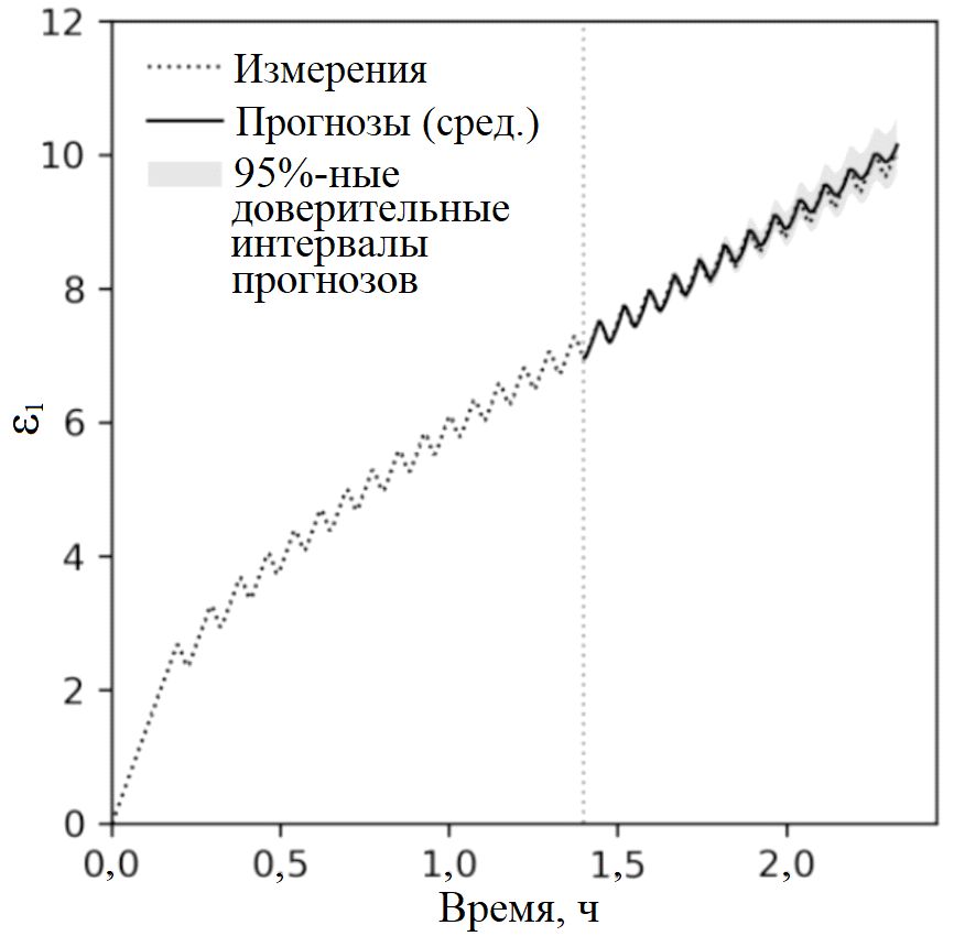 Недавние успехи в создании физически информированных конститутивных моделей [162 и др.] также показывают, что к более достоверным прогнозам может приводить основанное на данных моделирование с ограничениями, обусловленными законами физики (физически ограниченное). Кроме того, может использоваться метод стохастического отключения узлов/нейронов сети (метод дропаута), причем не только в качестве регуляризатора во время обучения, но и для генерации стохастических выборок на этапе вывода с применением дропаута по методу Монте-Карло, иногда называемого просто дропаутом Монте-Карло. Среднее значение предсказаний и их дисперсия, соответственно, отражают наилучшую оценку и эпистемическую (вызванную неполнотой знаний) неопределенность выходных данных модели (рис. 7, 8).