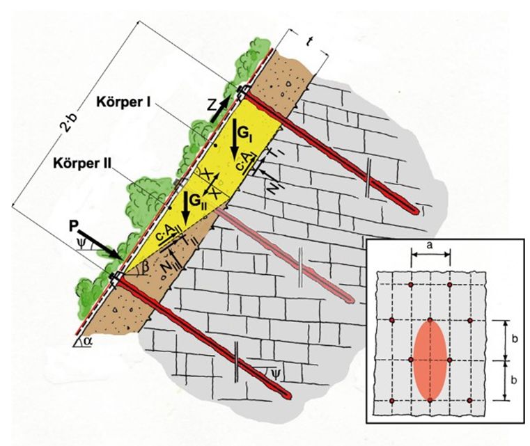Было очевидно, что рассматриваемую систему защиты и укрепления склона можно оптимизировать с помощью соответствующих комбинаций противоэрозионных матов и плетеных сеток из высокопрочной стальной проволоки, чтобы была возможность одновременно надежно прикреплять их к подстилающему грунту и предотвращать их соскальзывание со склона.