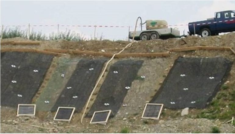 Швейцарская компания Verdyol проращивала семена трав на испытательной площадке с наклоном поверхности 30–45 град. путем гидропосева. Площадка была разбита на участки, покрытые геоматами, другими противоэрозионными материалами и не покрытые ничем (контрольные). На эти участки с помощью гидросеялки равномерно нанесли жидкую смесь из семян, мульчи (смеси на основе полых целлюлозных волокон длиной менее 4 мм, улучшающей свойства почвы) и закрепителя (связующего материала на основе водорослей для связывания между собой компонентов, заполняющих полости между волокнами геомата).