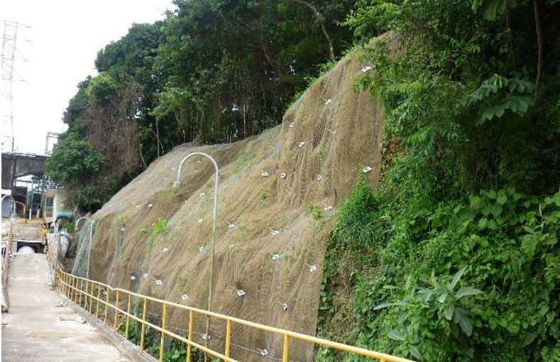 На территории города Мирафлорес (Панама) с использованием системы TECCO® было выполнено укрепление склона с очень неровной поверхностью, сложенного разнокалиберными обломочными породами. Геомат TECMAT® в сочетании со стальной сеткой TECCO® G65/3 (с диаметром окружности, вписанной в ромбовидную ячейку, 65 мм и толщиной проволоки 3 мм) удалось достаточно хорошо уложить на этом склоне со сложным рельефом с помощью крепления нагелями, хотя складки материала в некоторых местах, заметные на рисунке 11, говорят о том, что эти места не идеально повторяют форму поверхности склона. На том же рисунке видно, что на соседних участках, не покрытых геоматом, присутствует пышная растительность. На укрепленном противоэрозионным матом участке уже тоже появились всходы.