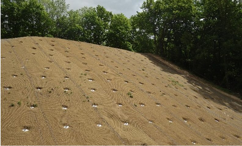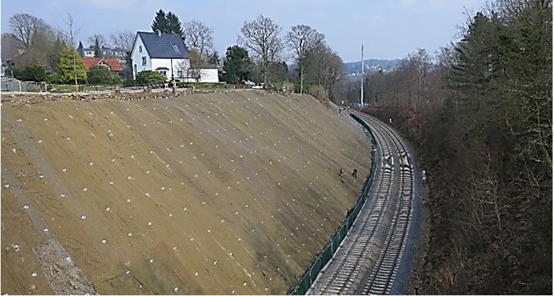При создании насыпей или подрезке склонов на них должен воссоздаваться и поддерживаться растительный покров не только для красоты, но и для обеспечения их долгосрочного укрепления. Высокую эффективность в этом отношении показали противоэрозионные маты из петлеобразно переплетающихся полипропиленовых волокон (геоматы), производимые швейцарской компанией Geobrugg AG. Их трехмерная структура позволяет снижать энергию удара дождевых капель и гидравлическое воздействие потоков стекающей воды. При этом частицы почвы, семена, корни и органические остатки сохраняют свое положение в полостях такой структуры, обеспечивая образование и поддержание растительного покрова. Чтобы увеличить прочность и устойчивость геоматов на более крутых откосах и склонах, их стали объединять с плетеными сетками из высокопрочной стальной проволоки, также специально производимыми для этих целей в Geobrugg AG. Благодаря таким системам "два в одном" можно эффективно защищать естественные и искусственные склоны и откосы, сложенные рыхлыми или выветрелыми скальными грунтами, одновременно удерживая и укрепляя на них почву и восстанавливая растительность.