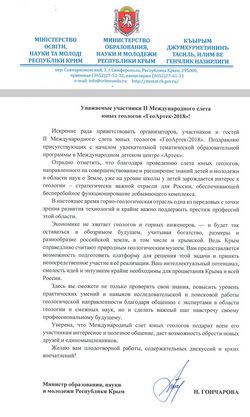 В приветственном обращении к юным геологам министр образования, науки и молодежи Республики Крым Наталья Гончарова отметила, что в экономике современной России не хватает геологов и горных инженеров, учитывая богатство, размеры и разнообразие российской земли, а участники Слета вполне могут исправить этот момент. «Отрадно отметить, что благодаря проведению слета юных геологов, направленного на совершенствование и расширение знаний детей и молодежи в области наук о Земле, уже на уровне школы у них зарождается интерес к геологии – стратегически важной отрасли для России, обеспечивающей бесперебойное функционирование добывающего комплекса, – подчеркнула министр, — Ваш интеллектуальный потенциал крайне необходим для процветания Крыма и всей России».