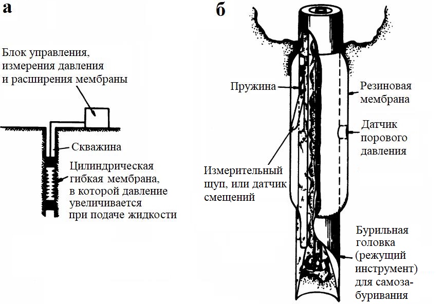 • самозабуривающийся прессиометр, который сам пробуривает скважину и таким образом меньше нарушает грунт до начала испытания.
