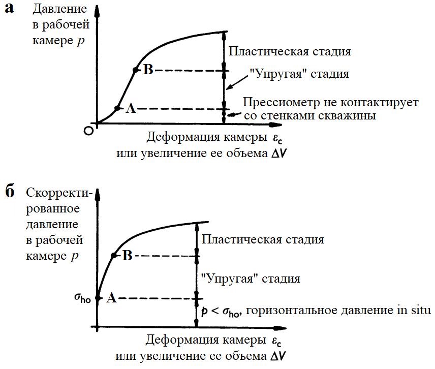 В дополнение к полному горизонтальному напряжению in situ график «давление в камере – ее деформация» может использоваться для оценки модуля сдвига грунта, прочности глины на недренированный сдвиг, а также пиковой прочности и угла дилатансии ψ песка. Включив в устройство датчики порового давления воды, можно также измерить коэффициент консолидации в горизонтальном направлении ch (который определяет уплотнение из-за горизонтальной деформации при горизонтальной фильтрации) и угол внутреннего трения ϕ‘ для глин. В настоящем обсуждении мы сосредоточимся на наиболее распространенных приложениях, а именно на определении полного горизонтального напряжения in situ и модуля сдвига, а также прочности глин на недренированный сдвиг. Детали процедур, используемых для определения других параметров, приводятся в работе Мэйра и Вуда 1987 года (Mair R.J., Wood D.M. Pressuremeter Testing: Methods and Interpretation // Construction Industry Research & Information. London: Association/Butterworths, 1987).