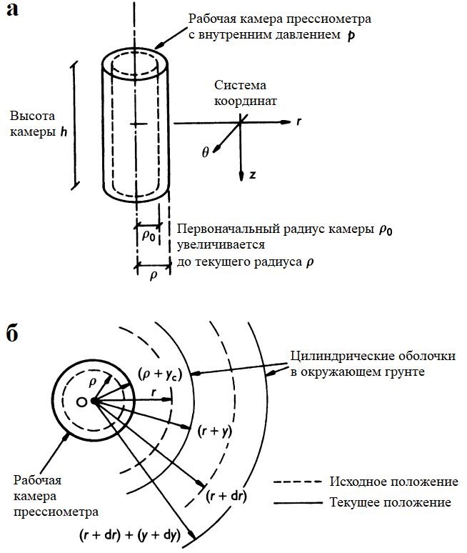 Рис. 11.13. Идеализированная геометрия деформации при испытании прессиометром (а) и поперечное сечение, показывающее радиальные смещения грунтовых цилиндрических оболочек с различными начальными радиусами (б)
