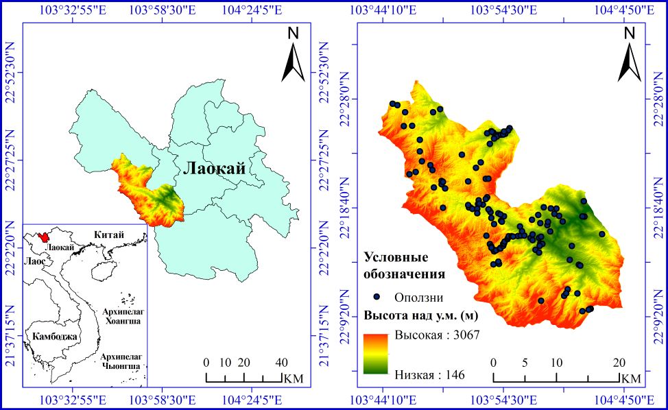 В районе исследования было выявлено в общей сложности 130 оползней, при этом наименьшая площадь оползня составила 395,6 м2, а самая большая площадь оползня – 70447,4 м2. Большинство оползней было зафиксировано в коммуне Чунгчай, в центре района Шапа, в коммунах Лаочай, Таван и Банхо (Рис. 1).