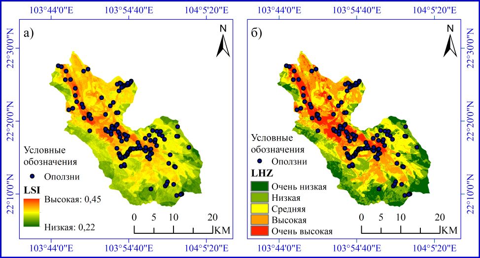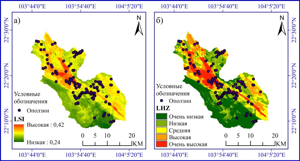 Рис. 2. Карта оползневой восприимчивости (a), карта оползневой опасности (б) с применением модели MAHP30