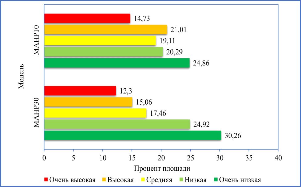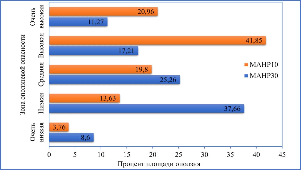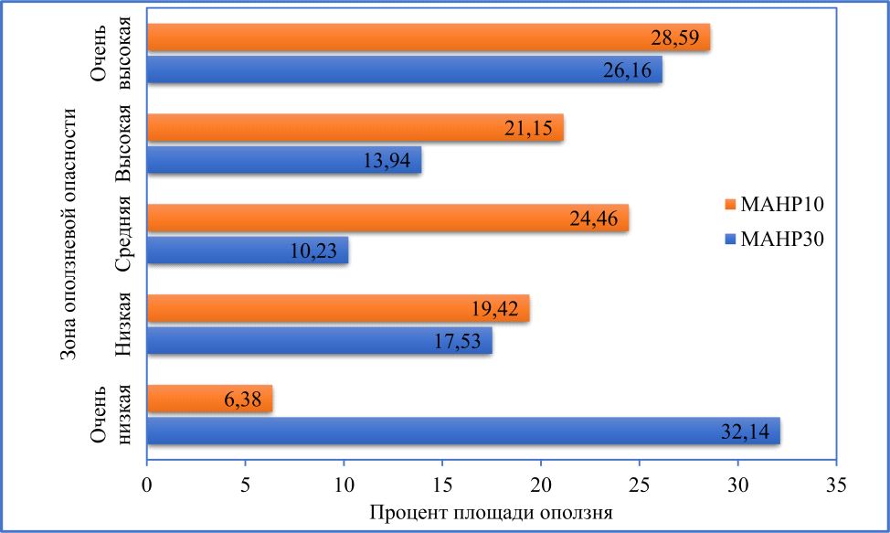 Рис. 4. Распределение зон оползневой опасности по площади с использованием моделей MAHP30 и MAHP10