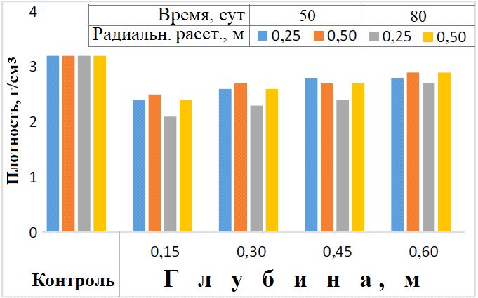 Рис. 3. Значения плотности образцов грунта, взятых на разной глубине от поверхности и на разном радиальном расстоянии от точки внесения свалочного фильтрата, через 50 и 80 дней