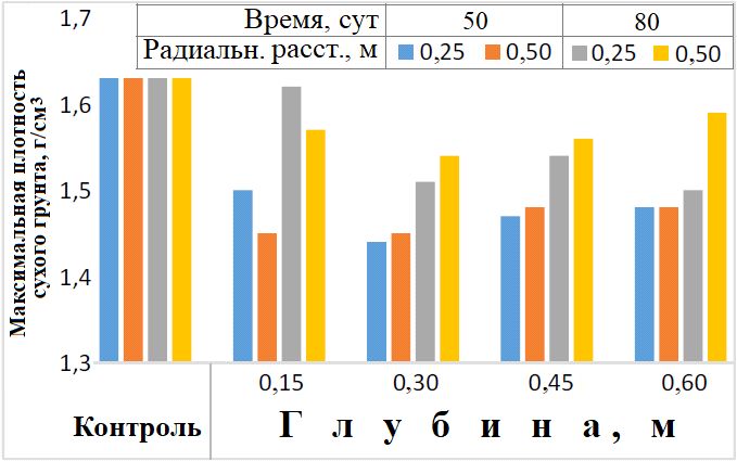 Рисунок 5 показывает, что оптимальная влажность загрязненных образцов растет с увеличением глубины (особенно на радиальном расстоянии 0,25 м через 50 дней) по сравнению с контрольными незагрязненными образцами. Это согласуется с результатами исследования гранулометрического состава, которые выявили большее процентное содержание более мелких частиц в загрязненных образцах (поскольку более мелкие частицы имеют большее сродство к воде и согласно известному правилу механики грунтов чем выше оптимальное содержание влаги, тем ниже максимальная плотность сухого грунта).