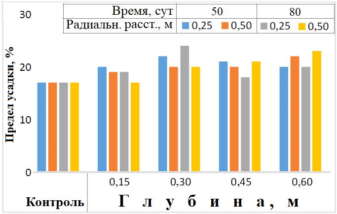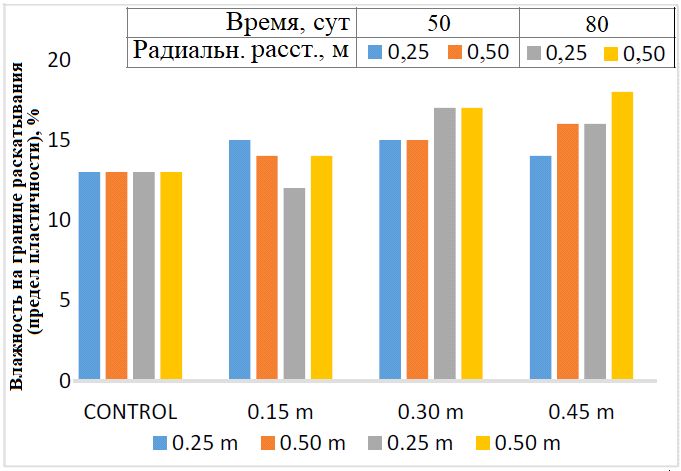 Воздействие свалочного фильтрата привело к увеличению влажности на границе текучести (предела текучести) загрязненных образцов грунта, отобранных через 50 дней, особенно на радиальном расстоянии 0,25 м и с глубиной (в целом). Но с увеличением срока «созревания» загрязненного грунта, то есть отобранного через 80 дней, предел текучести становится меньше (рис. 7).