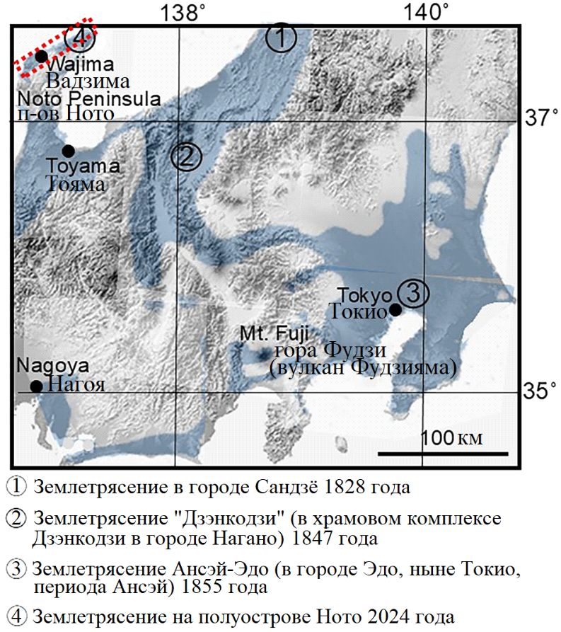 Рис. 1. Карта примерного распределения залежей газа, растворенного в подземных водах, в центральной части Японии (источники: [5] и Управление геопространственной информации Японии). Условные обозначения: 1–3 – эпицентры исторических землетрясений, при которых зафиксированы случаи возгорания метана; красной пунктирной рамкой обведена зона сейсмогенных разрывов при землетрясении на полуострове Ното 2024 года, цифрой 4 отмечен его эпицентр; голубовато-серым цветом показаны залежи растворенного в воде газа