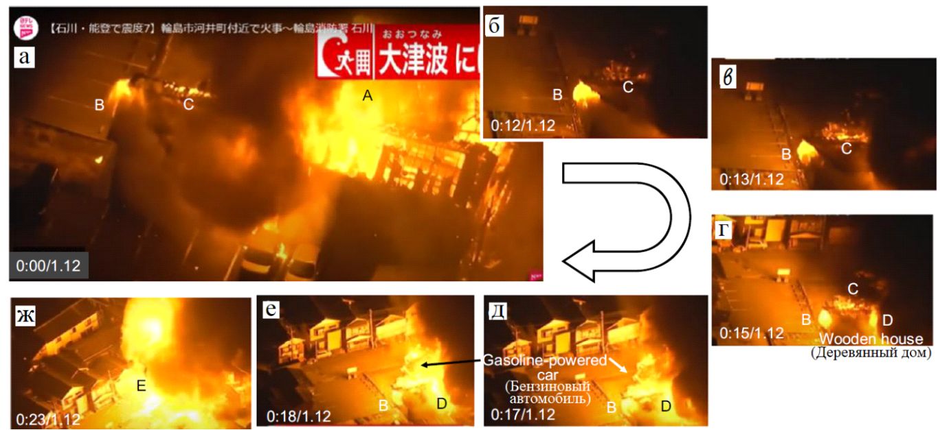 Рис. 2. Стоп-кадры видеосъемки пожара, сделанной с вертолета, в районе Каваи-мати города Вадзима (источники: Nippon TV, YouTube, https://www.youtube.com/watch?v=rKMNYqBqeic). Кадры расположены в хронологическом порядке начиная примерно с 22 минут после начала возгорания: а – стоп-кадр с тайм-кодом 0:00/1:12, то есть 0 мин. 0 с. при общей длительности видеозаписи 1 мин. 12 с (A – интенсивно горящее здание, B – фонтанообразный горящий факел, вырывающийся из-под земли, C – линейная полоса огня); б –ж – дальнейшая хронологическая последовательность стоп-кадров с отмеченными тайм-кодами, показывающая изменения в зонах фонтанообразного факела B и полосы пламени C. Можно увидеть распространение огня от полосы пламени C к баллонам со сжиженным газом и местам утечки топлива из автомобилей. Возгорание в зоне D возникло в результате перехода огня с баллона со сжиженным газом на топливный бак системы отопления. Возгорание в зоне E было вызвано взрывом бензобака автомобиля