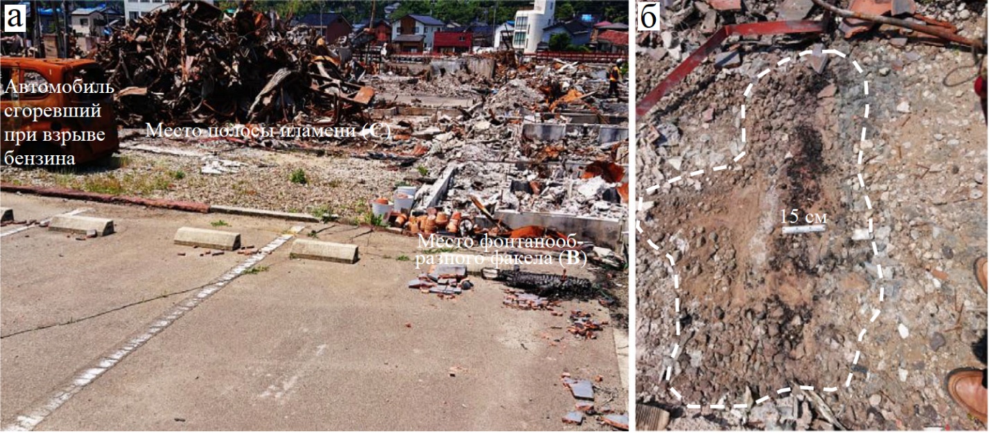 Были проанализированы новостные видеозаписи, запечатлевшие возникновение пожара сразу после землетрясения (например, с YouTube-канала Nippon TV [4]). Особое внимание мы уделяли форме, цвету и поведению пламени, наличию горючих материалов на поверхности земли и распространению огня. Эти признаки сопоставлялись с характеристиками обычных пожаров, выявлялись различия. На этой основе рассматривалась вероятность воспламенения горючих газов, вырывавшихся из-под земли.