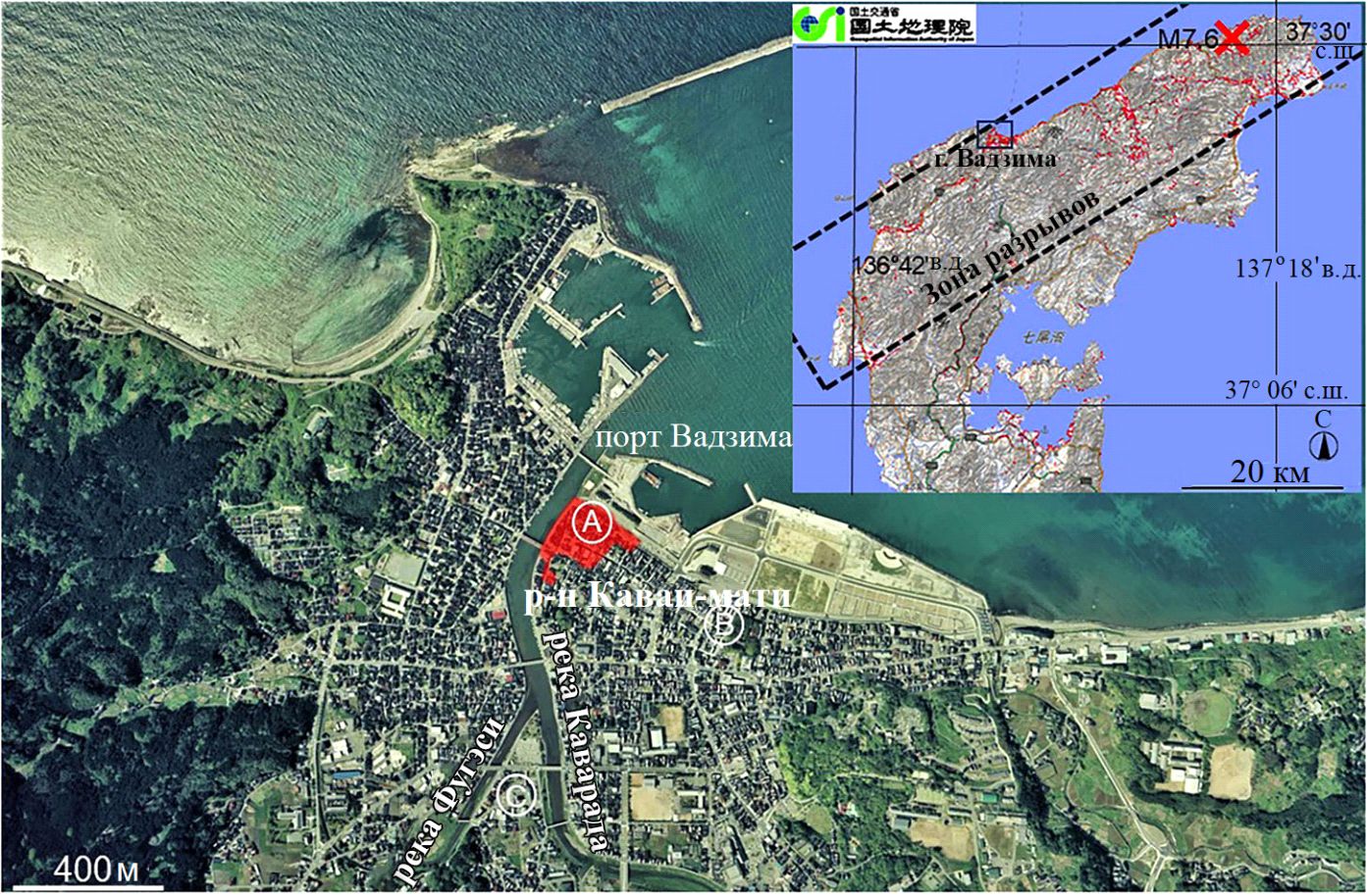 Рис. 4. Аэрофотоснимок города Вадзима (источник: Управление по геопространственной информации Японии). Буквенные обозначения: А – территория крупномасштабного пожара в районе Каваи-мати города Вадзима; B – место бурения скважины глубиной 30 м у здания мэрии города Вадзима (рис. 5, а); С – участок гидрогеологических изысканий (рис. 5, б). На врезке: красным цветом показаны места расположения трещин в грунте (источник: Управление по геопространственной информации Японии); черной штриховой рамкой примерно обведена оцененная зона сейсмогенных разрывов при землетрясении на полуострове Ното