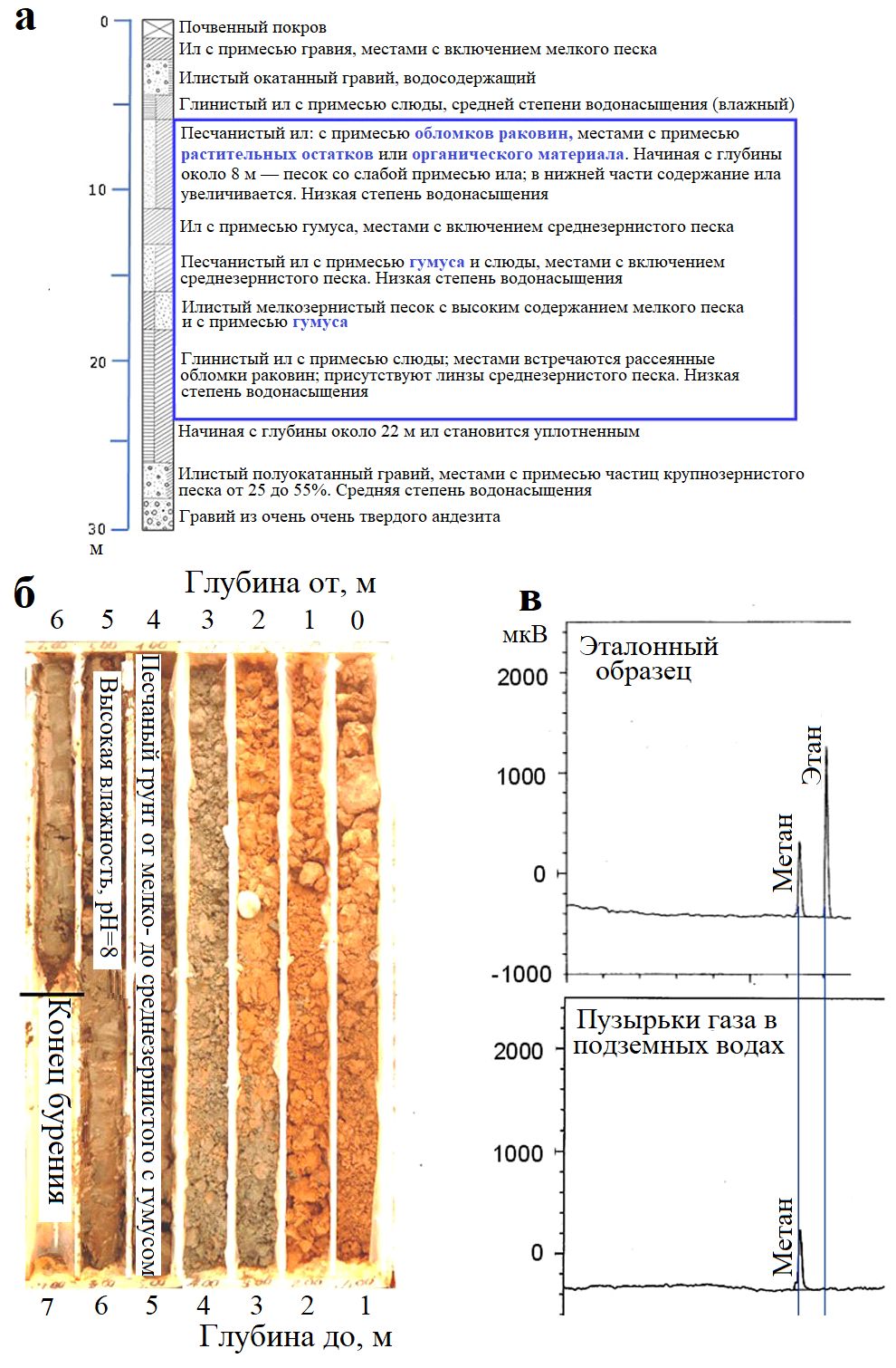Рис. 5. Геологические условия территории города Вадзима (источник: Управление по геопространственной информации Японии): а – геологическая колонка, построенная для точки B, показанной на рисунке 4 (синей рамкой обведена толща слабых илистых грунтов с высоким содержанием органических веществ [12]); б – геологическая колонка, построенная для точки C, показанной на рисунке 4; в – результаты газохроматографического анализа (вверху – для эталонного образца; внизу – для пузырьков газа, содержащихся в подземных водах в точке C)