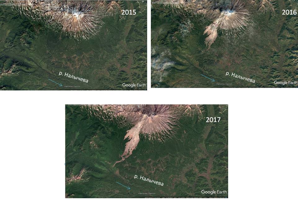Рис. 1. Формирование новой русловой сети на склоне Жупановского вулкана, связанное со сходом огромного объема пирокластического материала (лахара). На снимках из открытого архива GOOGLE EARTH видна ситуация до схода лахара (2015 год), сразу после события (2016 год) и постепенное продвижение пород в сторону русловой сети (2017 год)