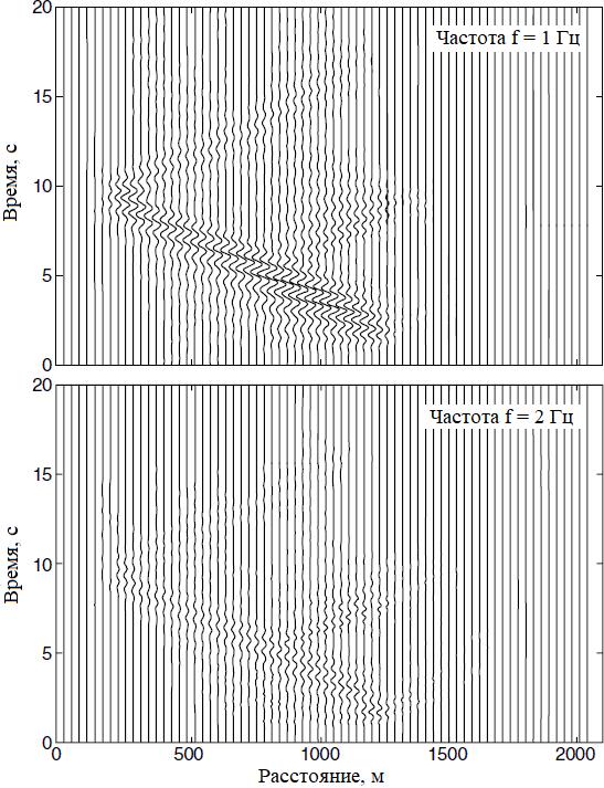 Особенно четко влияние геометрии границ подстилающих грунтов проявляется при наличии под дневной поверхностью погребенных палеодолин, характеризуемых сложным переслаиванием и «переплетением» грунтов с резко различающимися физико-механическими свойствами и сложной геометрией границ раздела. В результате этого возможно локальное усиление амплитуд сейсмических колебаний, что во многих случаях приводит к разрушению зданий и сооружений на дневной поверхности при отсутствии конструктивных предпосылок. Это подтверждает в том числе теоретическое моделирование сейсмических волновых полей, которое часто позволяет найти причины таких разрушений и принять меры по их устранению на случай последующих сейсмологических событий (рис. 3).
