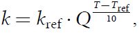 где kref – значения параметра, взятые из работы [22]; Tref – соответствующая температура (4 °C). Было принято, что параметр Q равен 2 [23, 24].