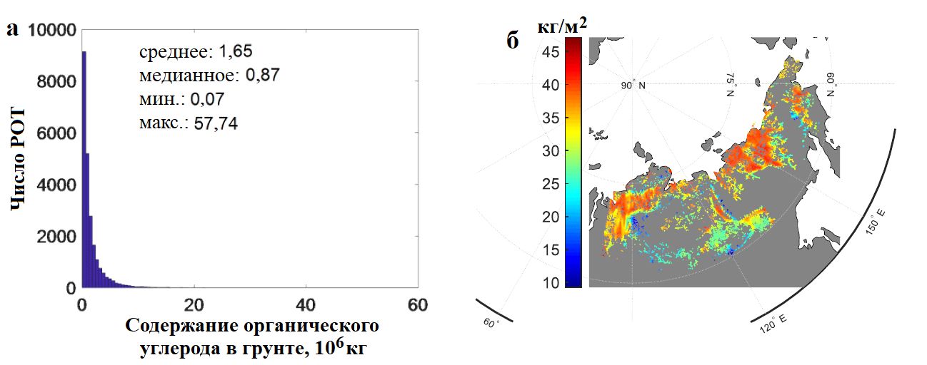 Абсолютное количество органического углерода в верхнем метре каждого РОТ находится в пределах от 0,05×106 до 43×106 кг (в среднем 1,25×106 кг). Согласно этому подходу в настоящее время в наружном метре грунта во всех закартированных сибирских РОТ в общей сложности присутствует 29 Тг (29×109 кг) атомов органического углерода.