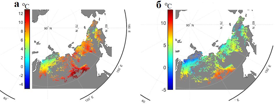 Автономное моделирование с помощью модели земной поверхности JSBACH показало, что текущие температуры наружного слоя грунта (0–30 см) составляют 0–12 °C летом (в июне – июле – августе) с выраженными градиентами по широте и долготе (рис. 2, a). Температура грунта выше 10 °C на юге Западной Сибири и в Якутии является причиной значительного выделения CO2.