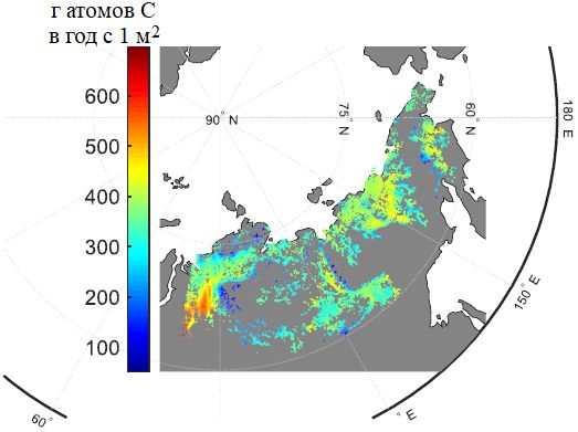 Применяя модель динамического разложения к доступным для тепла органическим веществам с учетом конкретной температуры наружного слоя грунтов и грунтов, находящихся глубже, авторы оценили минерализацию органических веществ, в среднем соответствующую выделению 367±213 г атомов углерода с 1 м2 РОТ в год (рис. 3). Это соответствует общему выбросу 0,42±0,22 Tг атомов углерода в составе CO2 в год из всех РОТ Сибири (1 тераграмм=109 кг=1012 г).