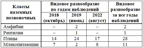 Общие сведения о видовом разнообразии наземных позвоночных, отмеченном в разные годы наблюдений на маршрутах и в результате отловов ловушками «Геро», приведены в таблице 1.