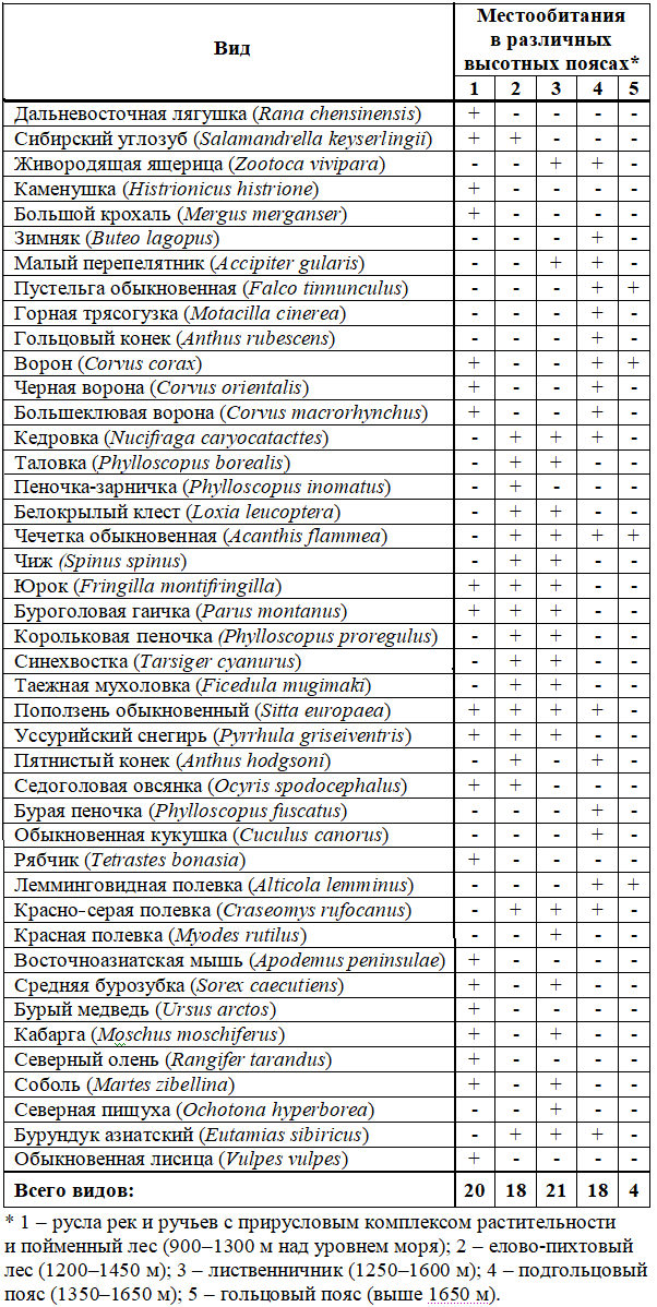 В обследованных высотных поясах отмечено 43 вида наземных позвоночных, в том числе 2 вида амфибий, 1 вид рептилий, 28 видов птиц и 12 видов млекопитающих. Самое большое видовое разнообразие наземных позвоночных в пределах рассматриваемой территории отмечено в склоновом лиственничнике (21 вид), а наименьшее – в гольцовом поясе (4 вида).